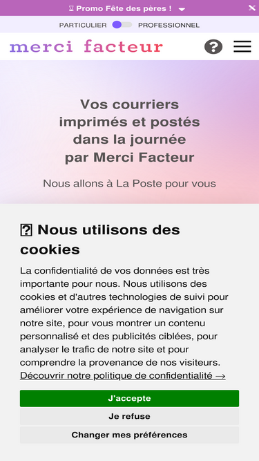 66%Merci Facteur est un service d'envoi par La Poste de courriers, lettres recommandées, photos, cartes de voeux, cartes d'anniversaires et autres cartes. Pour les particuliers et pour les professionnels, Merci Facteur imprime et poste vos courriers le jour même en acheminement rapide. Merci Facteur imprime et poste vos cartes, lettres, photos, recommandés le jour même.