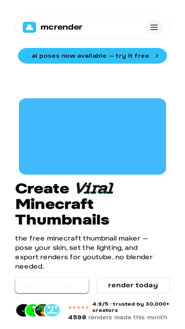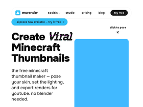 87%Render your Minecraft skin for YouTube thumbnails in seconds. No Blender needed. Free plan available. Trusted by 30,000+ creators.