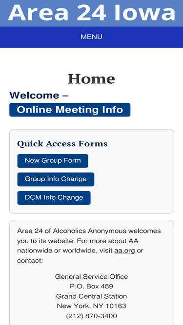 87%Reach Area 24 & Local Districts If you'd like to reach someone in Area 24, please use the contact form below. You can also find websites and contact information for local AA districts and intergroups across Iowa. District & Intergroup Websites Name Address Website Area 24 (State of Iowa)PO Box 1291 Des Moines, IA 50305aa-iowa.org