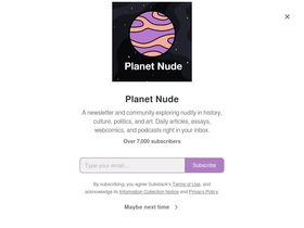 A newsletter and community exploring nudity in history, culture, politics, and art. Daily articles, essays, webcomics, and podcasts right in your inbox. Click to read Planet Nude, by Evan Nicks, a Substack publication with thousands of subscribers.