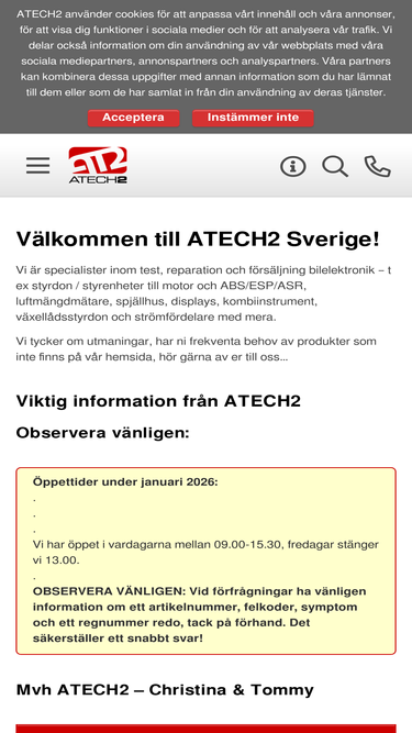 välkommen till atech2, vi är specialister inom test, reparation och försäljning bilelektronik – t ex styrdon / styrenheter till motor och abs/esp/asr, luftmängdmätare, spjällhus, displays, kombiinstrument, växellådsstyrdon, styrservo, navigationssystem/infotaiment och infotainmentsystem med mera.
