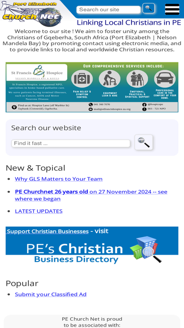 86%pe churchnet aims to foster unity among the christian churches of port elizabeth, south africa (nelson mandela bay) by promoting contact using electronic media, and to provide links to local and worldwide christian resources.