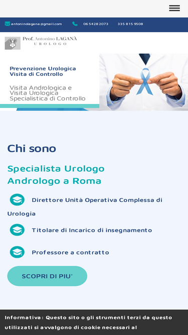 79%Tel. +39 335 815 9508 - 06 54282073 - Fax 06 54221596 Mail: antoninolagana@gmail.com Attività clinica e diagnostica: Urologo - Andrologo Roma Sud, zona Eur Svolgo la mia attività principale di consulenza specialistica urologica e andrologica presso il mio studio privato in zona Eur: Via Kenia, 58, 00144 Roma. Lo studio, situato nel cuore dell'Eur, è a pochi minuti dalle zone Portuense, Cecchignola, Mostacciano, Torrino, Ostiense, Marconi, Fonte Meravigliosa ed è facilmente raggiungibile dalla metropolitana B, fermata Eur Fermi (circa a 5 min a piedi). Per chi viene in auto, invece, se utilizzate il Grande Raccordo Anulare prendete l'uscita n. 26 del GRA (Pontina/Colombo/EUR), lo studio si trova a circa 2 minuti. Il posizionamento dello studio lo rende facilmente raggiungibile anche dalle zone del litorale laziale (Latina, Pomezia, Tor Vajanica, Ostia, Fiumicino, Acilia, Aprilia). Potrete trovare un facile parcheggio fronte strada non a pagamento. Per prenotare un appuntamento presso questa sede contattate il numero: 06 54282073 Attività chirurgica, Urologo - Andrologo Roma Nord, zone: Primavalle, Aurelia, Boccea, Prati - Flaminia, Corso Francia, Tor di Quinto, Cassia, Parioli - Nomentana, Viale Libia, Salaria Svolgo l'attività chirurgica presso le seguenti strutture private: Casa di Cura privata Villa Benedetta - Circonvallazione Cornelia, 65, 00165 Roma (zone Primavalle, Aurelia, Boccea, Prati) Clinica Ars Medica - Via Cesare Ferrero di Cambiano, 29, 00191 Roma (Flaminia, Corso Francia, Tor di Quinto, Cassia, Parioli)