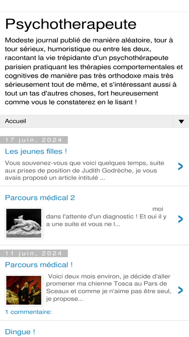 modeste journal publié de manière aléatoire, tour à tour sérieux, humoristique ou entre les deux, racontant la vie trépidante d'un psychothérapeute parisien pratiquant les thérapies comportementales et cognitives de manière pas très orthodoxe mais très sérieusement tout de même, et s'intéressant aussi à tout un tas d'autres choses, fort heureusement comme vous le constaterez en le lisant !