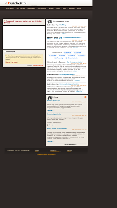 89%terry pratchett - genialny pisarz fantasy, twórca 'świata dysku'. jego discworld to bawiące inteligentnym humorem książki przedstawiające w krzywym zwierciadle naszą rzeczywistość. poznaj kultowe postacie jak mag rincewind, samuel vimes czy niania ogg. na stronie ciekawy artykuły, recenzje, cytaty, quizy i wiele innych