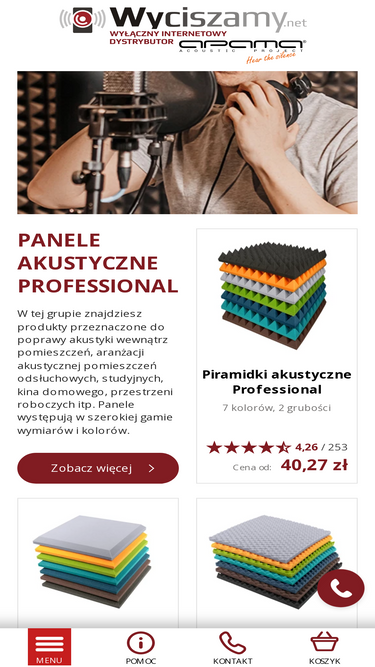 92%Piramidka akustyczna o wysokości 3 cm to ustrój akustyczny wykonany z pianki poliuretanowej w kolorze szarym, który bardzo dobrze rozprasz a i pochłania fale dźwiękowe. Oryginalna pianka akustyczna - PRODUKT NIEPYLĄCY Zalety zastosowań Piramidek akustycznych: poprawa akustyki wewnątrz pomieszczenia zmniejszenie fal stojących redukcja pogłosu ciekawy efekt wizualny łatwy i szybki montaż brak widocznych łączeń Piramidki akustyczne o wysokości 3 cm stosuje się do wygłuszania i poprawy akustyki wewnątrz: studiów nagrań pokojów odsłuchowych lokali mieszkalnych i biurowych sal widowiskowych, tanecznych itp. hal produkcyjnych Dostępne wymiary Piramidek akustycznych: - 95x90 cm lub - 90x190 cm Wysokość piramidek akustycznych: 3 cm Grubość podstawy: 1 cm Piramidki akustyczne są stosowane do poprawy akustyki wewnątrz pomieszczenia oraz do redukcji pogłosu. Najczęściej piramidki akustyczne montuje się na ścianach lub sufitach. Prawidłowe rozmieszczenie piramidek akustycznych poprawia komfort użytkowania pomieszczenia oraz jego parametry akustyczne. Pianka z której wykonana jest piramidka akustyczna ma budowę porowatą złożoną z wypełnionych powietrzem licznych, niewielkich połączonych porów o głębokim przenikaniu, lub włóknistą. Taka struktura pozwala na łatwe docieranie fal dźwiękowych w głąb materiału. Cześć energii dźwięku wskutek tarcia, lepkości powietrza wewnątrz porów oraz wibracji włókien zamieniana jest na energię cieplną. W ten sposób fala dźwiękowa jest pochłaniana przez piankę. Dodatkowo fale dźwiękowe są rozpraszane dzięki wypustką w kształcie piramidek na powierzchni pianki.