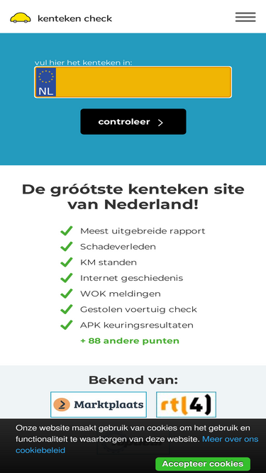 72%kenteken opzoeken? binnen enkele seconden gratis kenteken checken. rapport checkt o.a. voertuiggegevens, foto's, rdw kenteken data en schadehistorie