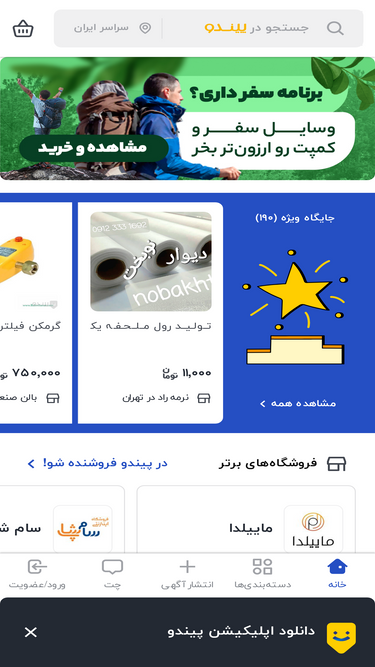 73%پیندو بازار آنلاین خرید و فروش بی واسطه کالای نو و خدمات است. تمام کسب و کار های کوچک و بزرگ، خانگی، محلی و کسب کار های خدماتی می توانند کالا یا خدماتشان را در پیندو به رایگان آگهی کنند.
