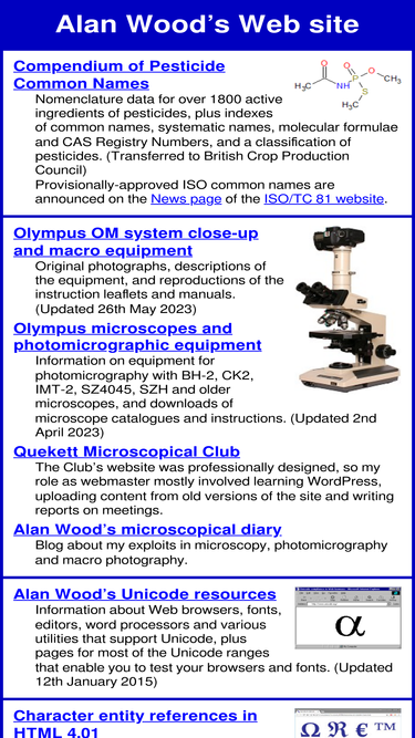 92%alan wood’s website, including pesticide common names, unicode, html 4 entities, symbol font, character sets, and olympus close-up photography equipment.