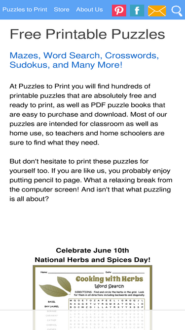 95%Load up on our fun printable puzzles. Word searches, crosswords, cryptograms, mazes, brain teasers, math games and lots of freebies. For children and adults.