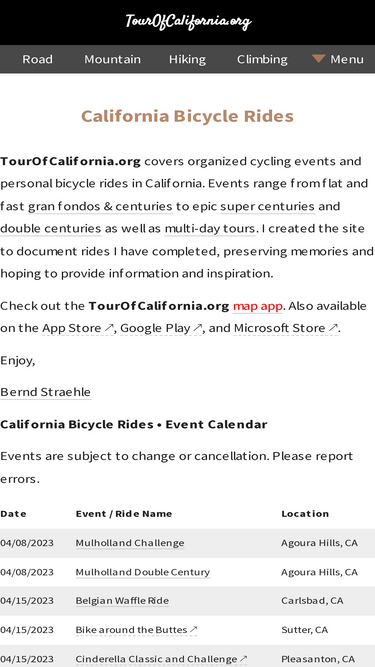 100%tourofcalifornia.org covers organized cycling events and personal bicycle rides in california, including gran fondos, centuries & more.