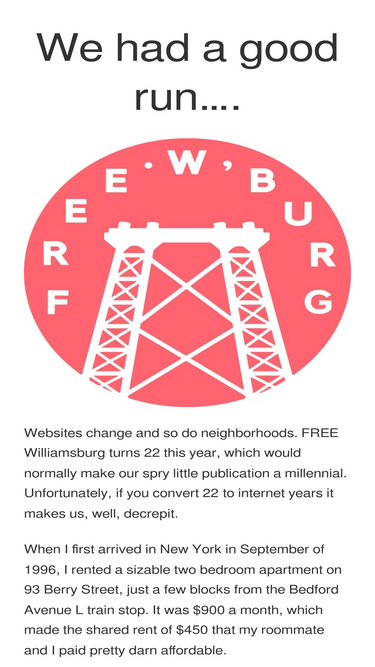 73%We had a good run…. Websites change and so do neighborhoods. FREE Williamsburg turns 22 this year, which would normally make our spry little publication a millennial. Unfortunately, if you convert 22 to internet years it makes us, well, decrepit. When I first arrived in New York in September of 1996, I rented a sizable two bedroomContinue reading "We had a good run…."