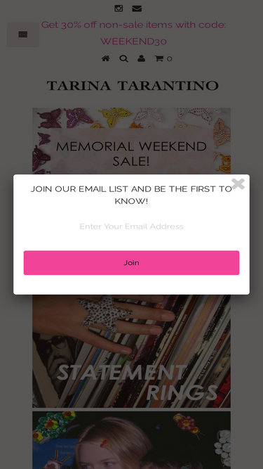 100%TARINA TARANTINO newsletter sign-up form. By signing up you will be the first to know about new collections, promo codes, events. Jewelry, Beauty, fashion