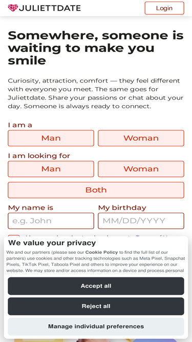 87%juliettdate strives to be an ultimate platform helping people meet worthy others while online. getting engaged with someone who caught your eye on should be easy and fun here.