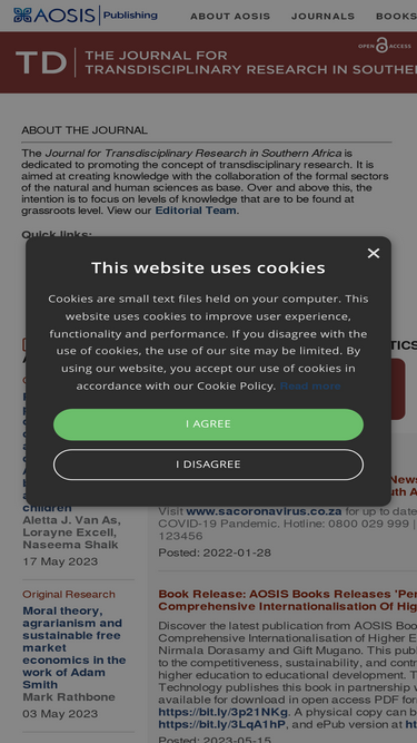 92%the journal for transdisciplinary research (td) is a journal dedicated to promoting the concept of transdisciplinary research. it is aimed at creating knowledge with the collaboration of the formal sectors of the natural and human sciences as base. over and above this, the intention is to focus on levels of knowledge that are to be found at grassroots level. it is important to explore this knowledge because it becomes the groundwork for further knowledge, which is often not confined to a fixed formal discipline or area of knowledge. the editorial team of the journal welcomes contributions of a theoretical nature, as well as material based on empirical research. preference is given to southern africa as a region of focus. however, should submitted articles show the potential for making a contribution towards our understanding of science beyond the confines of single disciplines, it would enjoy favourable consideration.