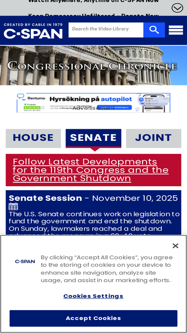 76%the c-span congressional chronicle is a comprehensive resource of the united states congress. watch c-span video recordings of house and senate proceedings. follow the congressional record while watching house and senate proceedings to read each speaker's official remarks. find representatives for every district, senators for every state, and members for every congressional committee. view detailed information about bills debated and votes taken.