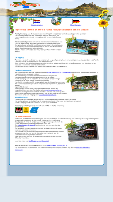100%deze camping aan de moezel beschikt over 27 ingerichte tenten en 98 mooie en ruime plaatsen voor kampeerders met caravan, vouwwagen of tent. de camping is anwb erkend, is rustig gelegen op slechts een paar uur rijden van nederland en staat bovendien onder nederlandse leiding.