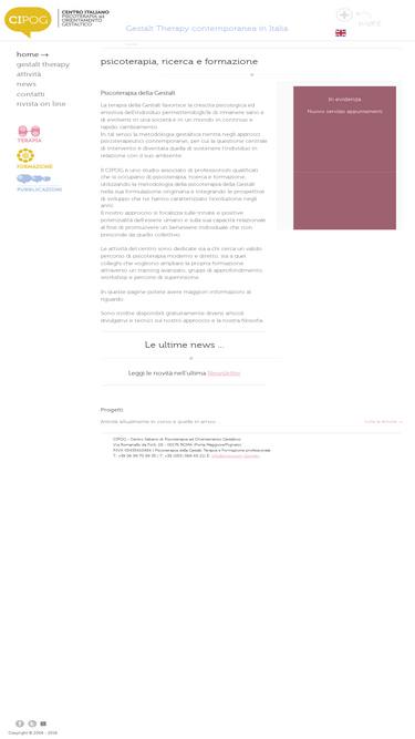 100%terapia della gestalt. il centro italiano di psicoterapia ad orientamento gestaltico, fondato e diretto dal dr. raffaele frisone e dalla dott.ssa giada bruni, è un punto di riferimento per la gestalt therapy contemporanea in italia. il centro ha sedi a roma, firenze e prato.