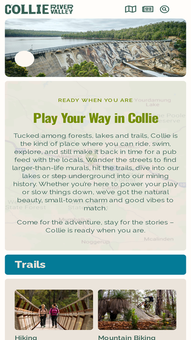 67%Tucked among forests, lakes and trails, Collie is the kind of place where you can ride, swim, explore, and still make it back in time for a pub feed with the