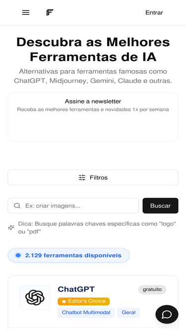 64%O maior diretório de ferramentas de IA em português. Ache a ferramenta perfeita para suas necessidades.