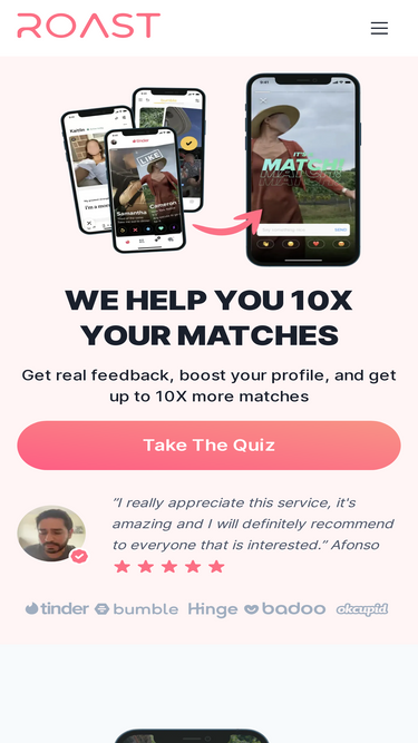 81%Get a winning edge on all dating apps with ROAST, the first expert profile review service! Get more dates, and find the one. Start today