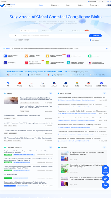 90%chemradar is a simple and powerful scanning tool designed to identify chemical compliance risks and ensure awareness of your regulatory obligations. it provides up-to-date regulatory information on hundreds of thousands of chemical substances related to import/export, hazard communication, chemical registration, and the restrictions on the marketing and use of hazardous substances worldwide.