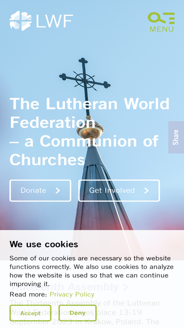 96%The Lutheran World Federation (LWF) is a global communion of Christian churches in the Lutheran tradition. Founded in 1947 in Lund, Sweden, the LWF now has 149 member churches in 99 countries around the world, representing more than 77.8 million Christians. The LWF acts on behalf of its member churches in areas of ecumenical and interfaith relations, theology, humanitarian assistance, human rights, communication and the various aspects of mission and development. The LWF is a member of Act Alliance.