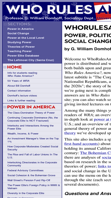 86%'Who Rules America?' by Bill Domhoff, the book upon which this website is based, presents detailed original information on how power and politics operate in the United States.
