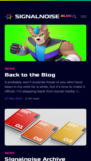 85%Signalnoise is the official blog of James White... designer, illustrator, and retro-futurist exploring bold neon art, creative process, 80s tech nostalgia, and behind-the-scenes design insights.