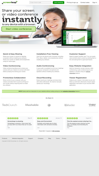 97%Free screen sharing using Screenleap. The fast, simple, and free way to share your screen instantly for online meetings, sales demos, and collaboration.