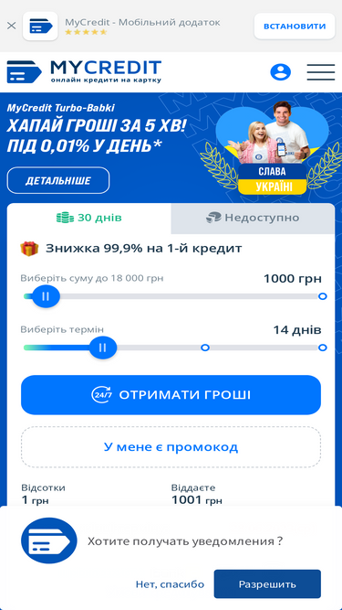 98%кредит онлайн для всіх жителів україни. видаємо кредит на картку для нових клієнтів з мінімальною процентною ставкою 0,01% на день. ви можете взяти до 15 000 гривень. швидке оформлення кредиту через bankid нбу з мінімальним пакетом документів