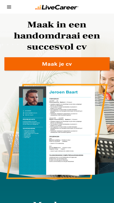 99%Hulp nodig bij het maken van je cv? Ons LiveCareer-team staat voor je klaar om al je vragen te beantwoorden. Ga direct aan de slag met onze cv-maker.