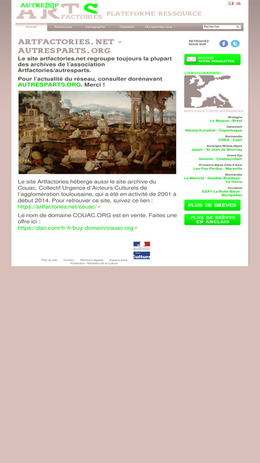 95%l'association autresparts, constituée en septembre 2000, groupe de réflexion réunissant des acteurs culturels et des chercheurs autour des relations entre art, territoire et société, a fusionné en novembre 2007 avec l'association artfactories, centre de ressources à l'échelle européenne sur les friches artistiques.