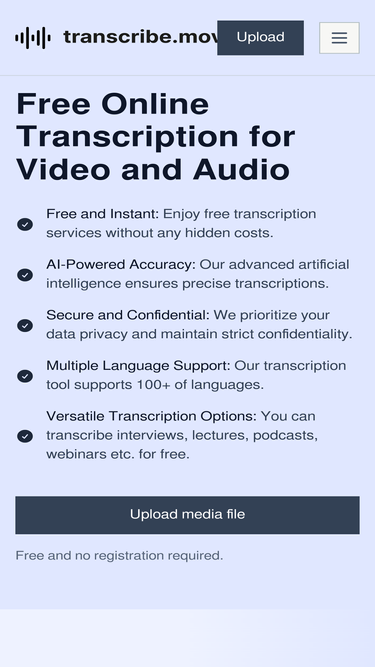 79%transcribe.mov offers free, accurate, and instant online transcription for audios and videos. convert your audio and video files to text effortlessly with our ai-powered transcription tool. experience seamless transcription, multiple language support, and top-notch data security. try transcribe.mov now and unlock the full potential of your content!