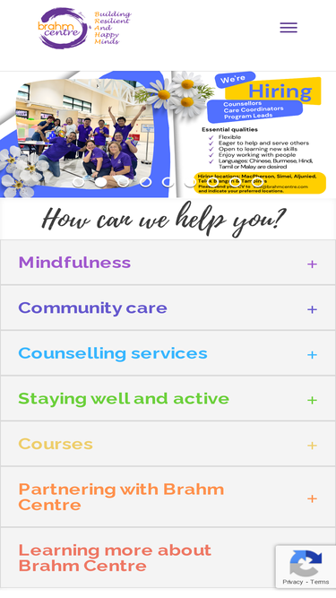 85%Launched in 2012, Brahm Centre is a registered charity that aims to promote happier and healthier living – focusing on proactive actions to empower individuals to help themselves in staying physically and mentally well. We are a full member of the National Council of Social Services and an Institution of Public Character (UEN 200200167M). All donations are 250% tax deductible.We offer many science-based mindfulness programs to reduce stress and enhance well-being. Our clients include healthcare agencies, schools and corporations.Weekly health talks conducted by healthcare professionals and qualified speakers are offered for free to the public.We have a care management team that is supported by a group of trained volunteers. Working closely with the Agency for Integrated Care and the Ministry of Health, we provide support to vulnerable elderly in the form of case management and befriending. We also collaborate with the People’s Association and grassroots leaders to increase the awareness of mental health issues and engage residents in active ageing programs and activities in MacPherson, Simei, Tampines, Moulmein-Cairnhill and Geylang Serai.