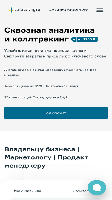 77%сквозная аналитика для эффективности маркетинга по roi и продажам. call tracking 99% анализ и оценка рекламы. смотри стоимость лида с рекламы. учет звонков, заявок, чатов и email. бесплатные интеграции, выгрузка отчетов. расчет cpl, ctr, дрр, прибыли и расходов. техподдержка 24/7