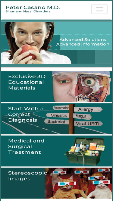 92%this site provides information about your nasal cavity and your sinuses. it describes the anatomy, the function, and goes over problems that can arise and surgical solutions that are available. topics including endoscopic sinus surgery, septoplasty, turbinate reduction, balloon sinus surgery, and packing are covered. links to the streaming videos are available and downloadable stereoscopic videos in several formats are provided.