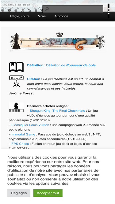 100%Note de l’auteurLes noms ont été changés et certaines scènes romancées pour restituer l’esprit des lieux et des échanges. La réplique de « 5 Vallées », comme d'autres détails, est fictive ou librement inspirée. Toute ressemblance exacte serait donc partiellement fortuite. 1. Le Théâtre des Platanes Parc de la Tête d’Or, Lyon — Chess 7 […]