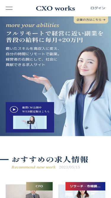 83%副業フルリモート/在宅での副業求人サイトなら登録無料のCXO works。これまでのキャリアで磨いたスキルを報酬に。自分の空いた時間にフルリモートで副業。クラウドソーシングだから、どこでも仕事が可能です。豊富な案件、魅力的な依頼が待っています。