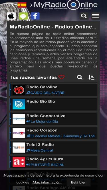Escuche las principales radios de Chile. Más de 100 emisoras de radio online. Disfrute su música y programas preferidos. Radios online y emisoras en vivo de todo Chile.