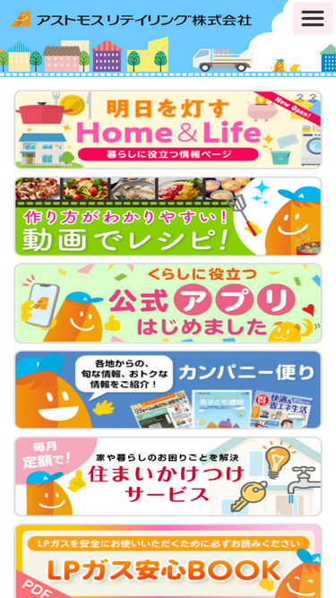 97%LPガスを中心にくらしに関するエネルギー・商品・サービスをワンストップで提供しているアストモスリテイリング株式会社のオフィシャルサイト。お客さまから選ばれ続けるエネルギーサービス事業者を目指します。
