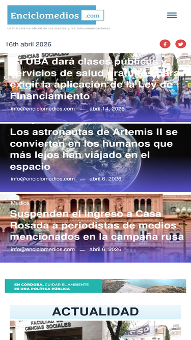 84%Medios La pauta oficial representa más del 50% del ingreso para 4 de cada 10 medios argentinos info@enciclomedios.commarzo 2, 2026 Actualidad Milei abrió las sesiones ordinarias: cruces con la oposición y el anticipo de la agenda de reformas info@enciclomedios.commarzo 2, 2026 Tecnología Cómo usar la nueva IA de Google para editar tus fotos como un profesional info@enciclomedios.comfebrero 23, 2026 Actualidad Ver más Publicaciones Medios Ver más Publicaciones Ocio Ver más Publicaciones Tecnología Ver más Publicaciones