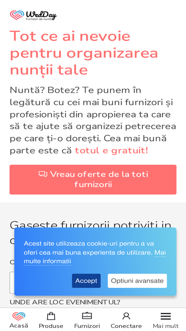 100%incepand cu o lista completa de sali de nunti din orasul tau si cei mai buni fotografi din domeniu,ne propunem sa iti oferim acces la toti furnizorii pentru nunta ta, intr-un singur loc. nunta ta incepe cu noi!