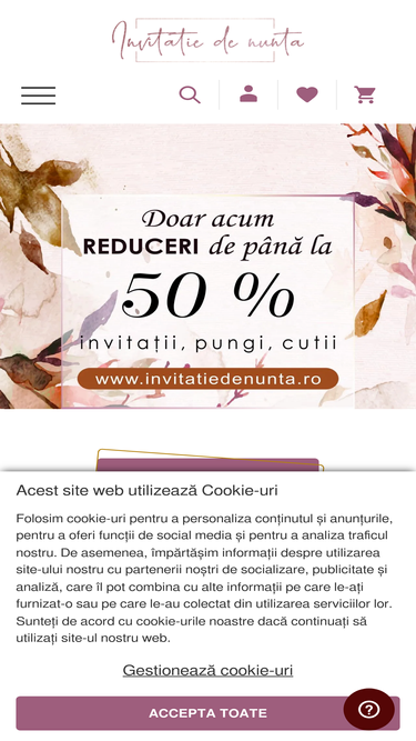 87%Invitatii de nunta la preturi accesibile, incepand de la 0.70 RON. O gama larga de modele, invitatii nunta deosebite cu texte personalizate pentru ziua speciala!