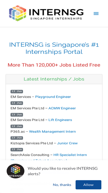 internsg.com es el cuarto sitio web más similar a fastjobs.sg y foundit.sg es el quinto. internsg.com y foundit.sg recibieron 110.5K y 267.2K visitas en noviembre 2025, respectivamente.