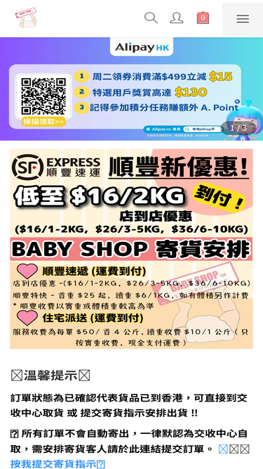 購買須知:客人需先建立帳戶方可於Baby Shop內購物,請記得填上可聯絡的電話號碼及電郵。建立訂單後會收到電郵通知,訂單狀態會顯示「處理中」,電郵內亦會顯示該訂單的所有詳細資料,敬請客人重新核對。付款後會收到電郵確認收款通知,付款狀態會由「未付款」 轉成 「已付款」。如未能成功付款,電腦系統將會自動取消該訂單;如有任何問題或困難,請儘快與我們聯絡。所有訂單不會自動寄出,一律默認為交收中心自取,需安排寄貨客人請於此連結提交訂單。【寄貨專用連結】順豐速遞 / 住宅派送如客人未有收到由電腦系統發出的電郵通知,請檢查閣下電郵之廣告/垃圾箱等位置;如確認沒有收到該電郵則代表閣下之訂單未能成功建立,亦有可能是下單時提供的電郵地址有誤。本公司為代購貨品出售,如供應商最終未能提供貨品,會作退款安排。如貨品未能訂購需安排退款,如訂單有預先回贈的購物金/折扣券,將會扣除有關款項後再退回款項。如貨品/食品有使用期限,過期後取貨不會安排退款/發貨。貨品如超過1年未有取貨,會自動取消訂單,不會再安排取貨及退款。付款方式:支持 Alipay HK 香港支付寶 及 Payme 及 八達通錢包 及 微信支付 及 信用卡 (含有3%手續費) 付款配送方式:收到閣下的訂單後,預購貨品到貨後不會安排自動寄出,請客人於訂單內回覆我們可以安排寄件,作為寄件確認,謝謝。發貨日期是以貨品包裝好後,交予第三方物流公司當天為定;而物流公司需消化大量不同寄件,逐一處理需時,其物流系統所顯示之日期可能會有所分別,敬請留意。Baby Shop 會盡量確保包裹包裝的完整性及安全性,但物流派送會有不可控制的風險,運送途中有機會因意外而令外箱 / 貨品外觀受影響,介意者建議請勿下單。客人收貨後,發現外箱包裝或商品有任何損毀 / 商品項目或數量與訂單不符,請立即拍照記錄貨品、外箱包箱及運輸單的當時情況,保留所有的物件,並於7工作天內儘快聯絡客戶服務員,我們盡快為您跟進。如寄送途中因物流公司失誤而導致貨品破損或遺失,我們會協助客人向第三方合作自取點服務商/ 物流公司追討,但恕不會作出任何賠償。如因客人自行下單時提供錯誤的送貨資料 / 物流公司多次聯絡客人失敗 / 客人無理拒收 / 客人逾時不取件、拒絕接受第三方合作自取點服務或物流公司安排的後備派件地址等等... 而導致送件失敗或貨品退回到本公司,當中產生的額外來往運費、安排第二次送貨運費、物流公司罰款等等,一概需由客人負責支付。訂單也有可能會被取消及不設退款安排。除個別商品列明有寄貨優惠外,否則將一律會使用「運費到付」形式」。商品資料:Baby Shop 出售之產品包含代理行貨及平行進口貨。如是平行進口的產品會在產品名稱處標明「平行進口」,我們保證出售之產品為百分百正貨。由於平行進口商品不時會出現版本升級或批次更新的情況,以收到之實物為準。部份商品相片由供應商所提供 / 實物拍攝,由於每部電話或電腦的解像度、燈光效果等拍攝效果不一,有機會會出現有某程度的色差,一切以最終實物為標準。如有任何疑問歡迎客人於訂購前向我們查詢。如有懷疑,請勿下單,以免產生不必要誤會或爭議。所有商品資料均以本公司之內容作標準,Baby Shop 保留解釋及修訂的權利。如有爭議,將以本公司的最終決定為依歸。訂單退換及售後須知:詳細請查閱退換貨政策本服務條款及我們向您提供的其他任何協議均受中國香港法律管轄,須依照香港法律解釋。如有任何爭議,由 Baby Shop Ltd 保留最終決定權。Baby Shop Ltd 保留隨時更改以上條款及細則之權利,而不作另行通知。