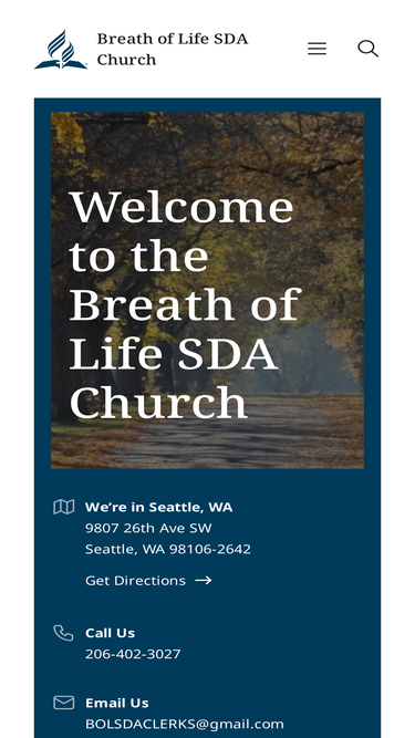 100%Breath of Life S.D.A. Church9807 26th Ave SWSeattle, WA 98106-2642206-402-3027 BOLSDACLERKS@gmail.com P.O. Box 46937 Zip Code 98146 Pastor Kimberly Watkins Pastor@bolchurch.org Phone #206-402-3027 Online Virtual Service Times:Bible Study: 10:00 amWorship Service: 11:00 am Additional Information Metro Transit