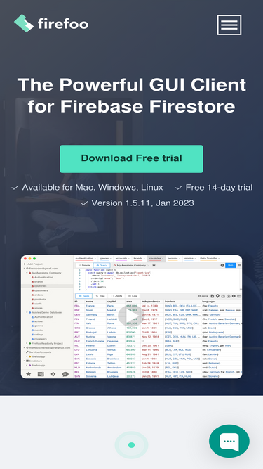 View and edit your data in a table, tree or JSON, export to JSON and CSV, run queries from a JavaScript shell.