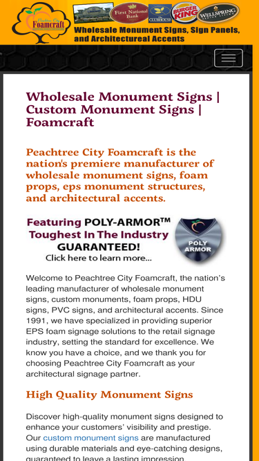 monument signs, wholesale monuments, eps, stucco, brick and stone signs, and foam props by peachtree city foamcraft.