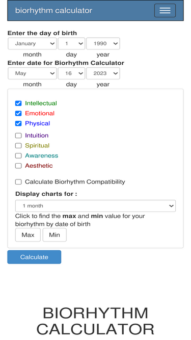 biorhythm calculator for physical, emotional and intellectual levels. calculate your biorhythms and biorhythm compatibility for couples.